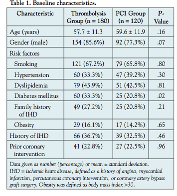 在研究期间,溶栓后冠状动脉造影术治疗180例(患者)和120例患者接受直接PCI治疗两组针对非前壁STEMI患者治疗效果对比,两组的基本特征相似,除了溶栓组糖尿病患者比例较高(表1)。因为只有稳定的患者被纳入研究,在基础心率和收缩压两组间无显著性差异。