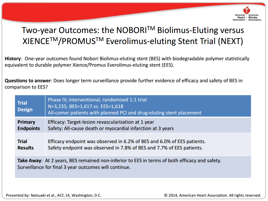 日本京都大学的Masahiro Natsuaki博士在2014年美国心脏病学会年会上公布了NEXT试验(the NOBORITM Biolimus-Eluting versus XIENCETM/PROMUSTM Everolimus-eluting Stent Trial)的2年结果。该研究旨在比较可降解聚合物和永久聚合物的第二代药物洗脱支架(DES)的有效性和安全性。