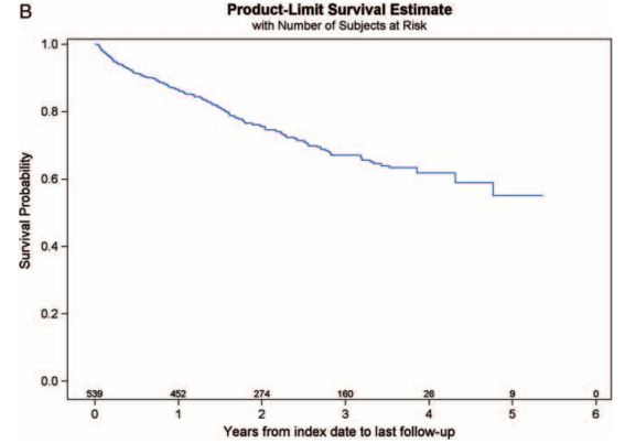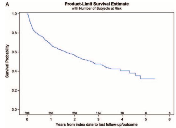 共病包括高血压(78%)、房颤或房扑(65%)、贫血(51%)、肾功能障碍(46%)、冠心病(33%)、糖尿病(30%)、肺部疾病(25%)和癌症(16%)。268例(50%)患者发生主要结局,其中死亡106例(20%)、心衰住院162例(30%)。