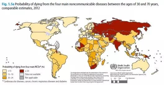 30-70岁非传染疾病死亡率分布。越红比例越高,下同。世卫报告