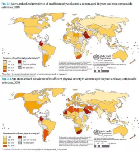 成年男性(上图)和女性(下图)运动不足人口比例。世卫报告