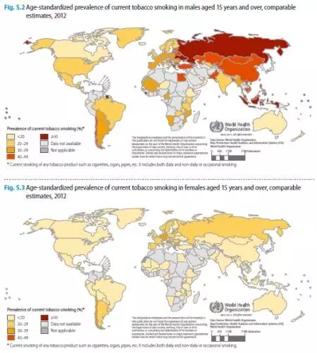 15岁及以上男性(上图)和女性(下图)吸烟人口比例。世卫报告