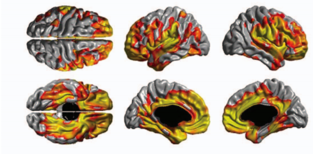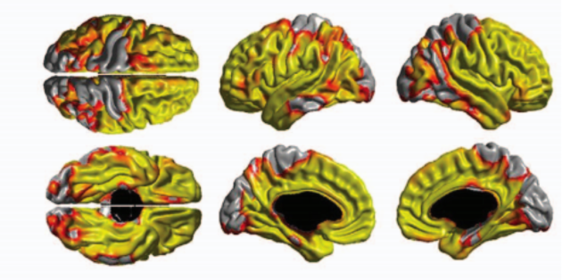 吸烟者和非吸烟者大脑皮层的差异:黄色部分代表吸烟者大脑皮层中厚度严重减少的部分。图片来源:研究论文