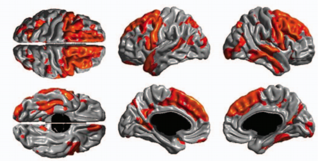 戒烟者和非吸烟者大脑皮层的差异:红色部分表示相比非吸烟者,戒烟者大脑皮层厚度微弱减少的部分。图片来源:研究论文