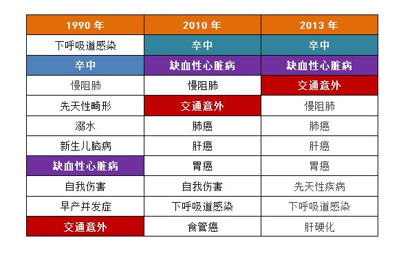 去年年底,世界权威医学杂志《柳叶刀》发布了《全球疾病负担报告2013》,该研究评估了1990年-2013年间188个国家的死亡情况,由华盛顿大学健康指标和评估研究所(IHME) 领导的国际研究人员联盟指导进行。报告显示,在中国,最致命的三种疾病是脑卒中、冠心病以及慢性阻塞性肺病,这三种疾病造成的死亡人数占2013年全部死亡人数的46%。而以世界卫生组织的定义,心血管病是心脏和血管疾患引起的,包括冠心病、脑卒中、高血压、心衰等。换言之,中国最致命三大健康杀手,心血管疾病占去两个。